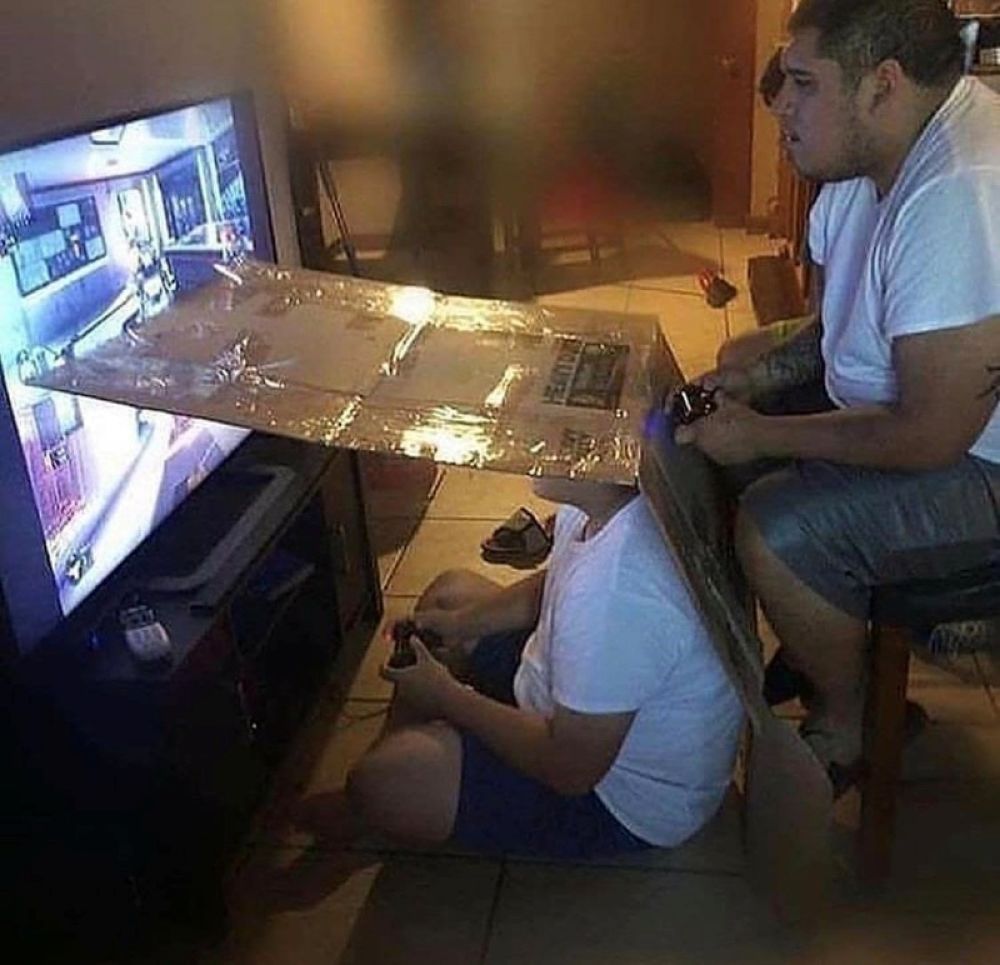 ภายในภาพดังกล่าวนี้ จะเห็นว่าได้มีเหล่าเกมเมอร์จำนวน 2 คน กำลังนั่งเล่นเกมแข่งขันแนว FPS ภายในจอเดียวกันอยู่ ซึ่งก็ยังได้มีการแบ่งภาพภายในเกมออกเป็น 2 ฝั่งอย่างเห็นได้ชัด แต่เพื่อไม่ให้เกิดความไม่แฟร์ที่ "ผู้เล่นคนหนึ่งจะสามารถมองไปจออีกฝั่งได้" จึงได้มีการนำแผ่นกระดาษที่ตัดมาจากกล่องขนาดใหญ่ เอามาบังไว้ครึ่งนึงของจอ และให้ผู้เล่นฝั่งจอด้านล่างไปนั่งบนพื้นเอาเสียเลย! ซึงนี่ก็ถือว่าเป็นการแก้เผ็ดที่ดีมากจริงๆ รวมทั้งเกมเมอร์ทุกคนก็สามารถนำวิธีนี้ไปใช้ได้ด้วย