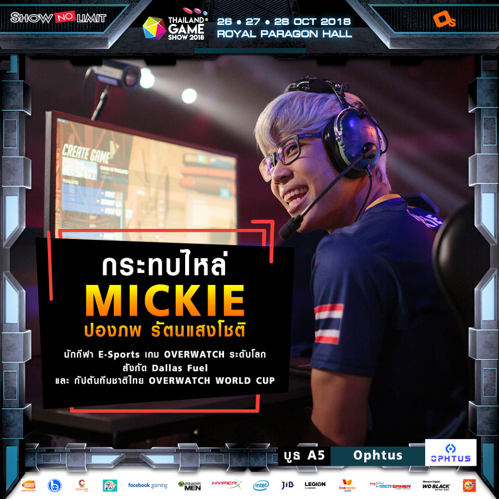 • Mickie ปองภพ รัตนแสงโชติ นักกีฬา E-Sports คนไทยระดับโลกที่ร่วมทีมแข่งขัน Overwatch กับทีม Dallas Fuel และกัปตันทีมชาติไทย Overwatch ที่จะมาปรากฏตัวพบปะพูดคุย ที่ บูธ Ophtus แบรนด์แว่นตาเกมมิ่งชั้นนำ