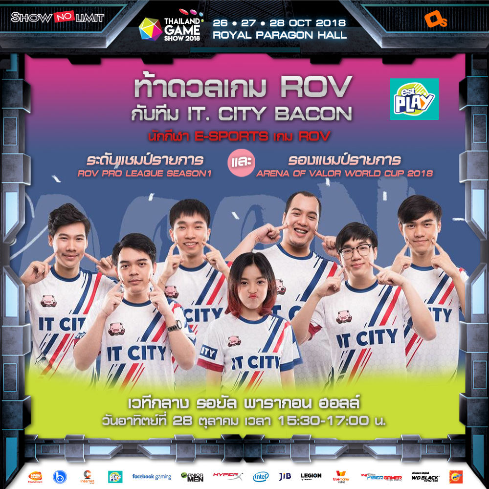 • ทีม IT CITY BACON นักกีฬา E-Sports คนไทยระดับโลก ที่จะมาระเบิดความมันส์กับกิจกรรม est PLAY ROV Challenge with IT CITY BACON เปิดโอกาสให้วัยทีนสุดซ่าได้ตีป้อม ROV เคียงบ่ากับทีม IT CITY BACON ที่เวทีกลาง วันที่ 28 ตุลาคม เวลา 15.30-17.00 น.