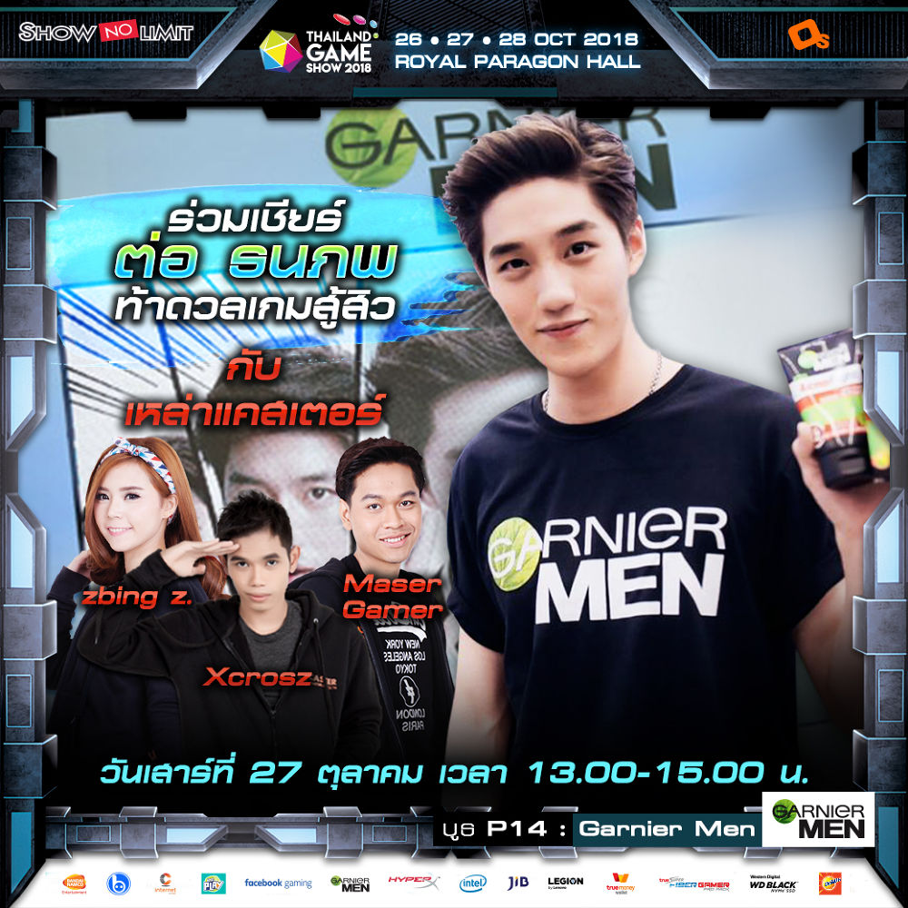 • พร้อมพบกับนักแสดงหนุ่มชื่อดังอย่าง ต่อ ธนภพ หรือเป็นที่รู้จักกันในชื่อ ต่อ ฮอร์โมน จะมาปรากฏตัวที่บูธ Garnier MEN กับกิจกรรมแฟนมีตติ้ง พร้อมทั้งท้าดวลแข่งขันเกมสู้สิวกับเหล่าแคสเตอร์ตัวท๊อป อย่าง ZBING Z. , XCROSZ , MASER GAMER .ในวันเสาร์ที่ 27 ตุลาคม เวลา 13.00-15.00 น. ที่บูธ Garnier Men