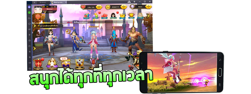 การเล่นบนโปรแกรมจำลองบน PC : ในยุคปัจจุบันเชื่อเลยว่ามีคนไม่น้อย เล่นเกมมือถือผ่านเครื่องคอมพิวเตอร์ ซึ่งโปรแกรมที่ใช้กันส่วนใหญ่จะเป็น Bluestack , NOX จากที่ทดสอบเล่นบน Bluestack ดูก็ไม่พบปัญหาใดๆ อีกทั้งการ Login สลับไปมาด้วย facebook ID ก็สะดวกสบาย เรียกได้ว่าอยู่ที่บ้านก็เล่นหน้าคอม พอออกนอกบ้าน พกมือถือติดตัวไป ก็สามารถเล่นต่อได้ ทุกที่ทุกเวลา