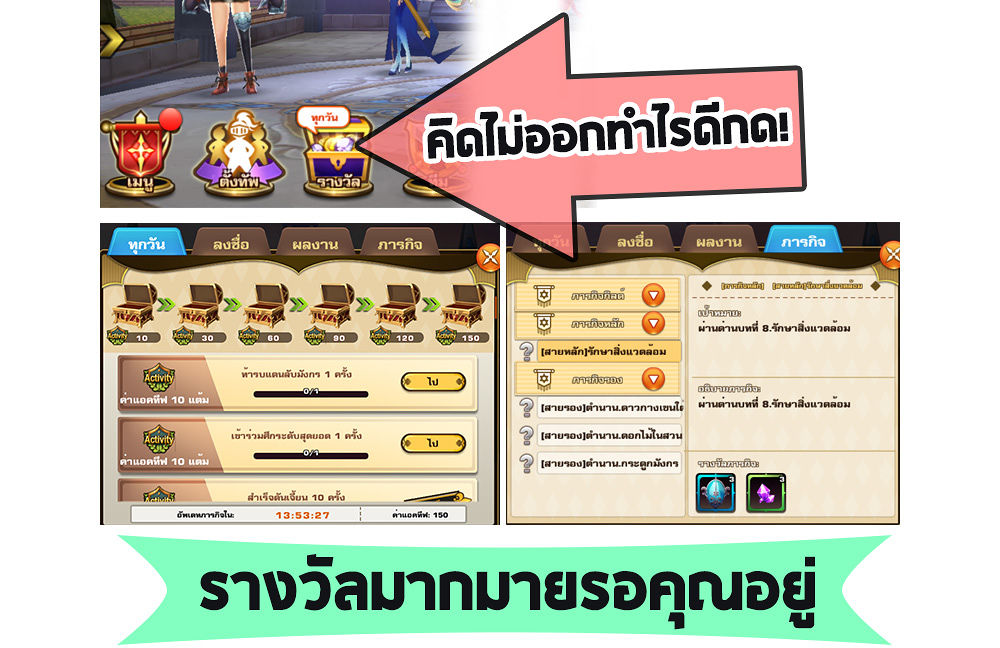 สำหรับผู้เล่นที่รู้สึกมึน ไม่รู้ทำอะไรต่อดี แนะนำให้คุณกดที่ปุ่ม "รางวัล" จะมีรายการเควสประจำวัน, ภารกิจ ต่างๆ ที่เราต้องทำแสดงไว้อยู่ ซึ่งหากพิชิตเงื่อนไขเหล่านี้ได้ คุณจะได้รับสิ่งของตอบแทนมากมายกลับมาอีกด้วย
