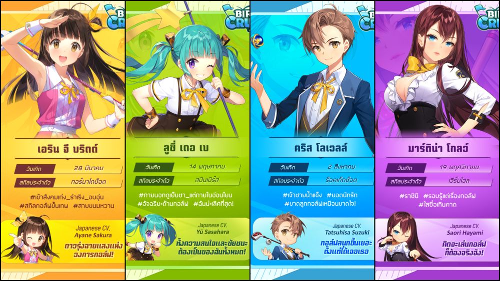 - Birdie Crush เป็นเกมที่เริ่มมาจะมีให้เลือกเล่นได้ 4 ตัวละครด้วยกัน ดูภาพแต่ละตัวละครได้ตามด้านล่างนี้