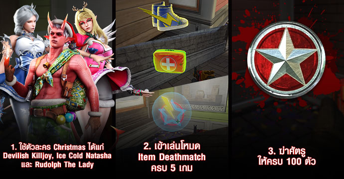 ชวนคุณมาร่วมพิชิตภารกิจในโหมดใหม่ Item Death Match เพื่อรับไอเท็มฟรีได้ง่ายๆเพียงเข้าเล่นเกมในโหมด Item Deathmatch โดยใช้ตัวละคร Devilish Killjoy, Ice Cold Natasha หรือ Rudolph The Lady ครบ 5 เกมและกำจัดศัตรู 100 ตัว เพียงเท่านี้ รับไปเลยไอเท็มสุดคูลปืน M4 Penguin ฟรี! ไม่มีที่ไหนให้ได้เท่านี้อีกแล้ว ภาระกิจง่ายๆของรางวัลคุ้มค่ามาร่วมกันทำภารกิจได้แล้วตั้งแต่วันนี้ถึง 3 มกราคม 2561