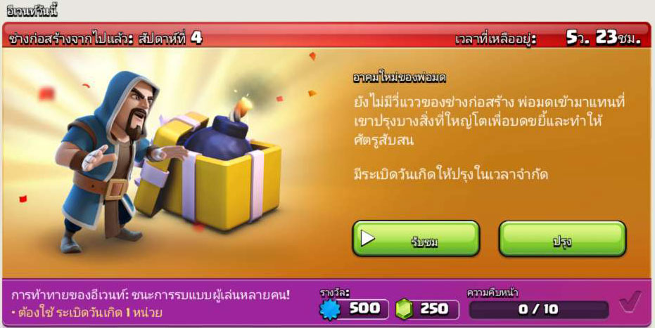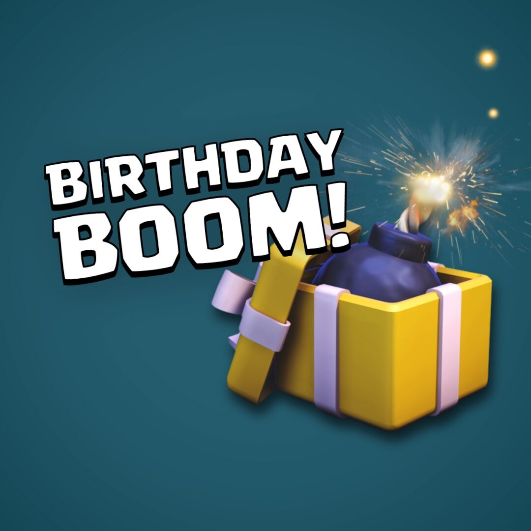 เอาล่ะค่ะ ในที่สุดก็ถึงเวลาฉลองครบรอบวันเกิดอายุ 5 ขวบของเกม Clash of Clans กันแล้วนะคะ แต่แทนที่จะได้ฉลองกันแบบสวยๆ หล่อๆ เจ้าช่างก่อสร้างตัวดีดันน้อยใจแอบหนีเที่ยวไปซะงั้น เหล่าทหารในหมู่บ้านก็ต้องเกณฑ์กำลังกันมาผลัดทำหน้าที่ช่างก่อสร้างแทน และสัปดาห์นี้ก็เป็นคิวของ Wizard เจ้าพ่อมดขี้เก็ก เขาก็เลยคิดไอเดียสร้างอาคมชนิดใหม่ขึ้นมาเพื่อเป็นการฉลองครบ 5 ปีไปเลย ด้วย Birthday Boom ระเบิดวันเกิด คาถาที่มีลักษณะเป็นกล่องของขวัญ แต่ภายในยัดด้วยระเบิดแรงสูงอีกด้วย! โห คิดไม่ถึงเลยนะเนี่ยว่าวิธีนี้จะใช้ได้ด้วยBirthday Boom ไม่ใช่กับดักแต่เป็นอาคม หรือขวดน้ำยา Spell ชนิดหนึ่ง(เหนือธรรมชาติกันเลยทีเดียว) จึงต้องสร้างใน