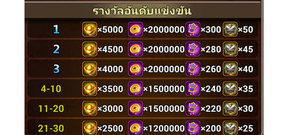 เป็นระบบต่อสู้เพื่อจัดอันดับในเกม เพื่อนๆจะต้อง PVP กับผู้เล่นคนอื่น ทุกครั้งที่สู้ชนะจะได้เหรียญพิเศษเอาไว้แลกซื้อ ชิ้นส่วนขุนพลหรือไอเทมหายาก ยิ่งลำดับสูงยิ่งได้รับรางวัลมาก โดยภายในหนึ่งวันจะสามารถประลองได้ 5 ครั้ง และหากใครอยากประลองมากกว่านั้นสามารถซื้อสิทธ์เพิ่มได้ด้วย