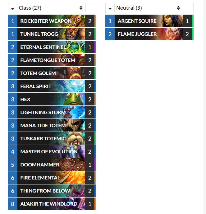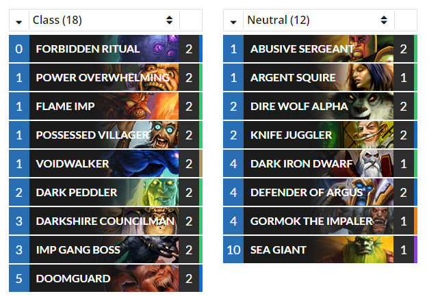 เป็น Deck ที่ทำผลงานได้ดีใน Standard เน้นมอนสเตอร์ตัวเล็กตัวน้อยในต้นเกมและครองบอร์ดให้ได้เพื่อรอการ์ดใหญ่ๆไว้จบเกม จากลิสต์จะเห็นได้ว่าตัวหลักๆจากโหมดเด่า เช่น Voidwalker, Imp Gang Boss และ Doomguard ยังอยู่ครบ จเสีย Dust ทำเพิ่มไม่เท่าไหร่ การเล่นยังคงเดิมๆอยู่ไม่เปลีย่นไปมาก