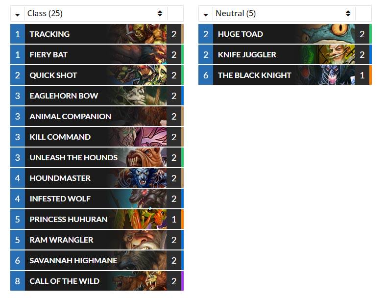 หลังจากการจากไปของ Aggro Hunter (หรอ?) เลยนำ Deck ของ Chakki ขวัญใจขาวไทยมา โดยใบเด็ดๆคือ Fiery Bat, Infested Wolf, Princess Huhuran และ Call of the Wild ที่ใหม่ของ WoG ซึ่งแต่ละใบคุ้มค่าร่ายมาก โดยเฉพาะ Call of The Wild ที่เรียกหมู Charge หมี Taunt และสิงโตคิเมร่า(หรือเปล่า) สุดออกมาพร้อมกันทำให้สามารถช่วงชิงจังหวะได้เลย