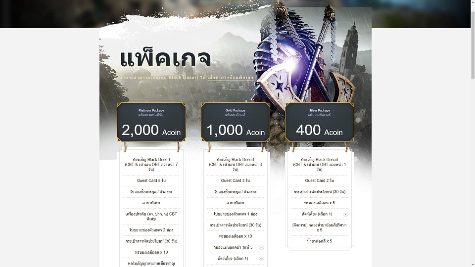 ● สำหรับเกม Black Desert เซิร์ฟเวอร์ไทย [TH] จำเป็นต้องซื้อแพ็คเกจในก่อนเข้าเล่นก่อน โดยจะแบ่งออกไป 3 ราคาด้วยกัน Silver Package 400 Acoin, Gold Package 1,000 Acoin และ Platinum Package 2,000 Acoin โดย 1 Acoin คิดเป็นเงินไทยเท่ากับ 1 บาท ( ดูรายละเอียดเพิ่มเติมได้ที่ คลิ๊กที่นี่ )