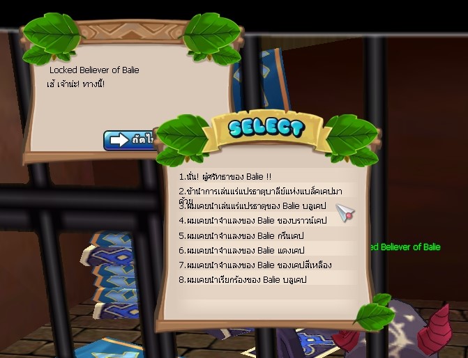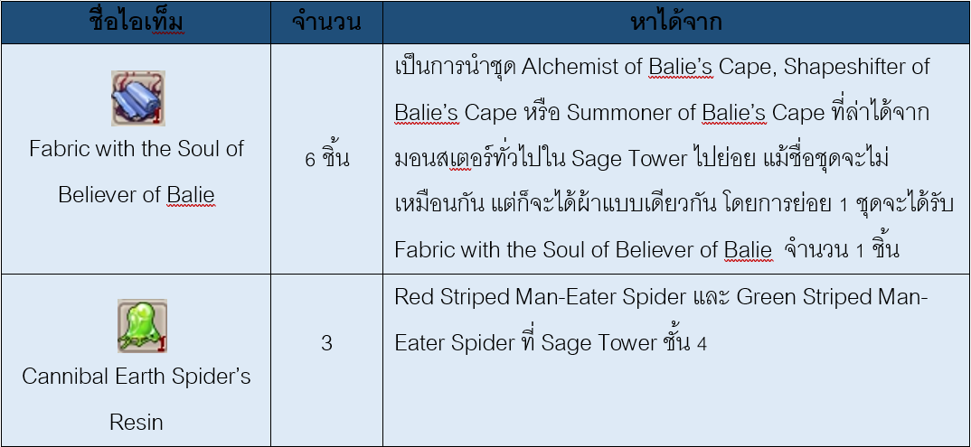 - ให้เราคุยกับ [NPC]Locked Believer of Balie เพื่อทำการย่อยชุด Balie’s Cape ให้เป็น Fabric with the Soul of Believer of Balie เมื่อมีวัตถุดิบทั้ง 2 อย่างครบแล้ว จึงจะสามารถทำชุด Leader of Balie’s Cape ได้