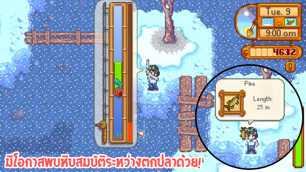วันไหนว่างจากการทำฟาร์ม เพื่อนๆสามารถไปตกปลาได้ตามสถานที่ต่างๆในเกม ไม่ว่าจะเป็นแม่น้ำ ทะเล หรือทะเลสาบ ซึ่งปลาที่จะตกได้ก็แตกต่างกันไปตามสถานที่ตก แถมยังมีโอกาสพบหีบสมบัติระหว่างตกปลาด้วยนะ การตกปลาในเกมนี้ค่อนข้างจะยากสักหน่อย ดังนั้นการหาซื้อเบ็ดและเหยื่อดีๆมาใช้ก็เป็นสิ่งจำเป็น! ยังไม่หมดแค่นี้ ยังมีปลาในตำนานที่ตกยากจนอยากจะร้องไห้มาท้าทายฝีมือเราอีกต่างหาก ใครตกไม่ได้อย่าเพิ่งท้อไป สักวันมันจะต้องเป็นของเรา!