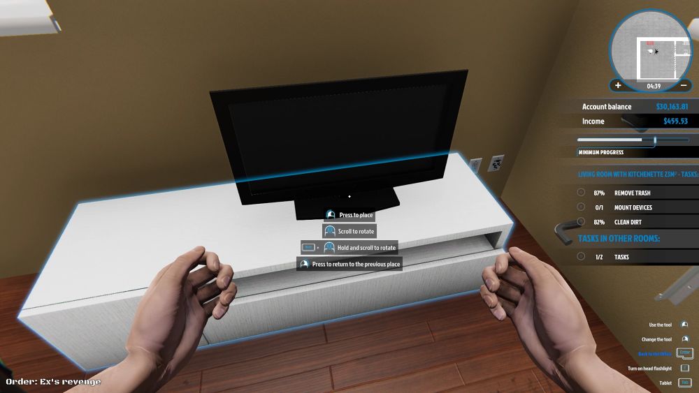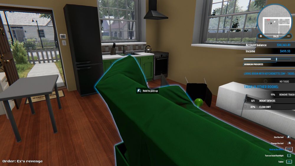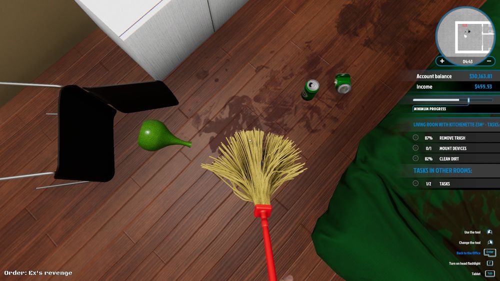 โดยบ้านหนึ่งหลังจะแบ่งออกเป็นห้องๆ แต่ละห้องก็จะมีเงื่อนไขย่อยๆให้เราทำต่างกันไป เช่นห้องนี้เก็บกวาดขยะ แล้วติดตั้งเครื่องทำความร้อน ห้องนี้เช็ดกระจก ห้องนี้เช็ดคราบสกปรก ซ่อมปลั๊กไฟ เป็นต้น ในแต่ละบ้านจะมีหลอด Mission Progress หรือหลอดความสำเร็จโดยรวม ถ้าเราทำไปจนถึงระดับที่ถึงเงื่อนไขก็สามารถยื่นเรื่องเสร็จงานได้เลย โดยไม่ต้องทำทุกอย่างให้ครบก็ได้ ซึ่งตอนนี้ไม่แน่ใจว่ามันจะมีผลกระทบกับเราหรือเปล่า เช่นเครดิตการทำงานเป็นต้น แต่ถ้าทำจนครบ 100% ทุกอย่างเราจะได้เงินค่าตอบแทนเยอะขึ้นนั่นเอง บางห้องนี่มีรังแมลงสาบด้วย ต้องใช้เครื่องดูดฝุ่นดูดนะ