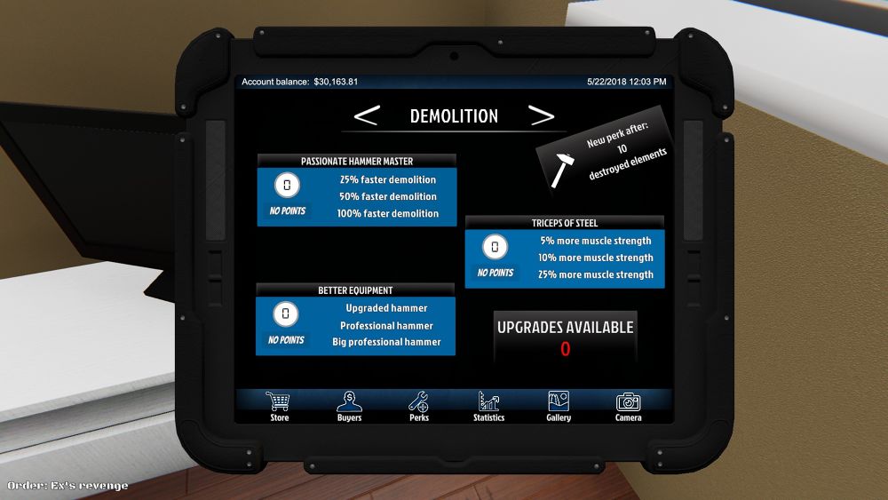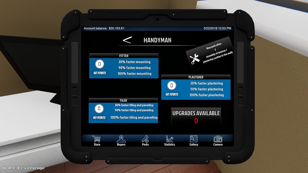 นอกจากนั้นเกมยังมีระบบ Perks ที่เกิดจากการทำงานด้านนั้นๆจนเชี่ยวชาญ เช่น ถ้าหากคุณทำความสะอาดบ่อย จนเลเวลอัพ คุณก็จะได้รับแต้มสำหรับอัพสกิลด้านทำความสะอาดด้วย เช่น อัพเกรดไม้กวาดให้ทันสมัยขึ้น ทำความสะอาดได้เร็วขึ้น โชว์สิ่งสกปรกบนมินิแมพเป็นต้น หรือถ้าเป็นด้านการทำลายคุณก็จะได้ค้อนทุบบ้านอันใหม่ที่แรงขึ้น ทุบได้เร็วขึ้นเป็นต้น แม้กระทั่งที่เกี่ยวกับการทำงานโดยตรงเช่น ได้รับโบนัสมากขึ้นจากการทำงานก็มี แหม ช่างเป็นสกิลที่อยากให้มีในชีวิตจริงๆเลยนะ
