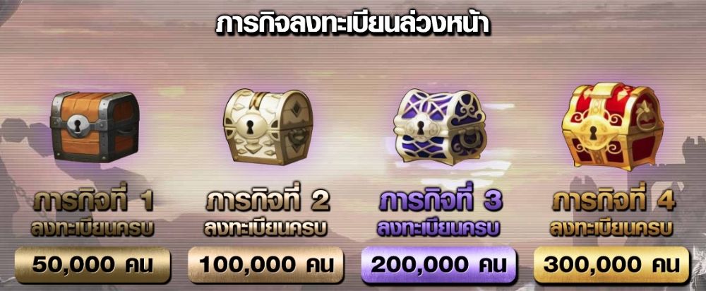ใช้เวลาเพียงไม่นาน ภารกิจแรก ยอดผู้ลงทะเบียนก็ทะลุ 50,000 ID แล้ว เป้าหมายต่อไปก็ไม่ใช่เรื่องยากแล้วล่ะ! สำหรับเหล่าเกมเมอร์คนใดที่ยังไม่เข้าร่วมกิจกรรมก็รีบมาสมัครสมาชิกล่วงหน้ากันเลย อย่ารอช้า เพราะหมดเขตวันที่ 5 มกราคม 2018 เท่านั้นนะ