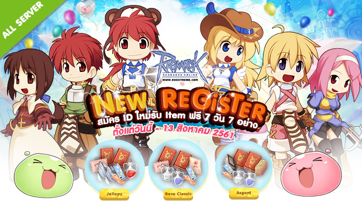 กิจกรรมที่ 2 : สมัคร ID ใหม่ รับไอเทมฟรี! 7 วัน 7 อย่าง ( 13 ก.ค. - 13 ส.ค. 61 )► ขอต้อนรับผู้เล่นใหม่ด้วยไอเทมจัดเต็ม เพียงลงทะเบียนสมัคร ID ใหม่ ก็เข้ามากดรับไอเทมเก็บเวลได้ฟรีทุกวัน 7 วัน 7 อย่าง สมัครฟรี! ไม่มีค่าใช้จ่าย พร้อมรับไอเทมมากมาย ตั้งแต่วันนี้ – 13 สิงหาคม 2561 กิจกรรมนี้เข้าร่วมทุกเซิร์ฟเวอร์ Revo Classic (Thor, Loki, Valkyrie) / Jellopy / Asgard