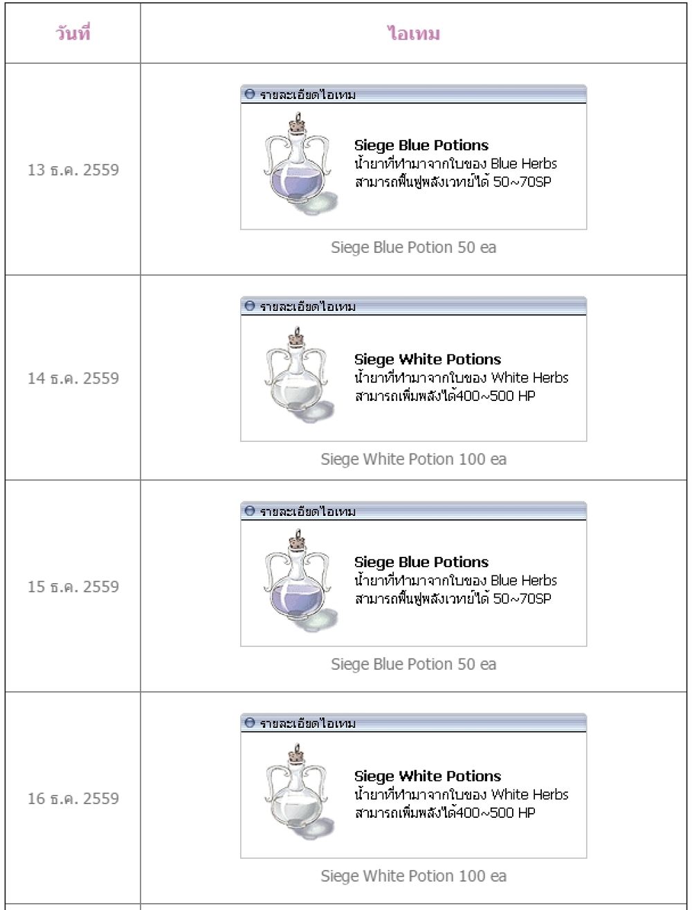 - ผู้เล่นจะต้องเข้ามากดรับของรางวัลจากทางหน้าเว็บไซต์เพื่อเป็นการเข้าร่วมกิจกรรมทุกวัน หากไม่ได้เข้ามากดรับในวันใดวันหนึ่ง ของรางวัลจะถูกเปลี่ยนเป็นรางวัลสำหรับในวันถัดไปทันที ไม่สามารถกดรับไอเทมย้อนหลังได้