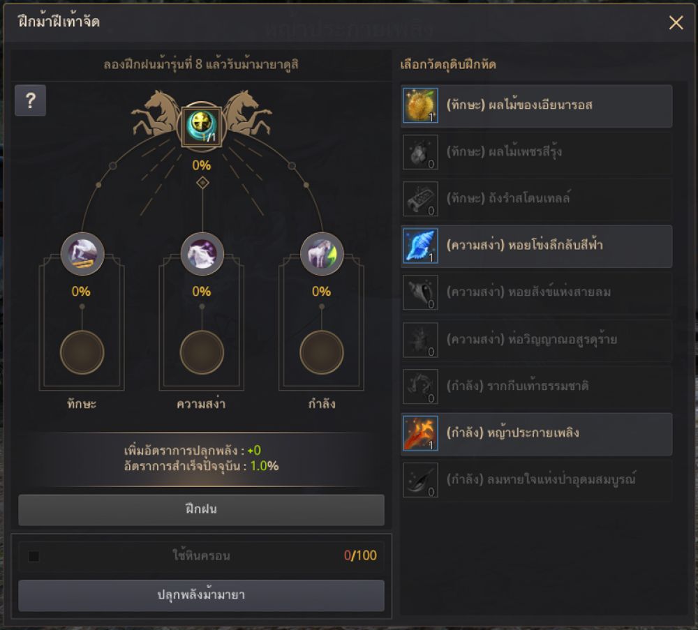 - เพิ่มให้แสดงอัตราความสำเร็จตามจำนวนการเพิ่มอัตราการปลุกพลังม้ามายาในขณะฝึกม้าฝีเท้าจัด