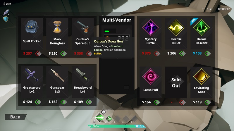 แต่ยิ่งไปกว่านั้นพวกอาวุธ - ทักษะสกิล - เครื่องรางเสริมพลัง [Artifacts] ของตัวละครจะหากไปทั้งหมดเช่นกัน เนื่องจากว่าพวกอาวุธ - ทักษะสกิล - เครื่องรางเสริมพลัง [Artifacts] ในเกมนี้จะหามาสวมใส่ก็ต่อเมื่อเราจัดการศัตรูลูกกระจ๊อกและเหล่าบอสเพื่อเคลียร์ด่านนั้นๆ เรียบร้อย (เลือกได้แค่อย่างใดอย่างหนึ่ง) หรือไม่ก็ใช้เงินซื้อสิ่งเหล่านี้จากเครื่องกด Multi-Vendor ที่อยู่ตามจุดแวะพักระหว่างทาง