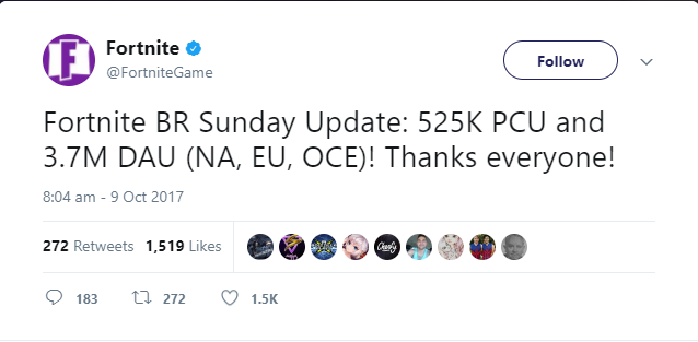 สถิติเดิมของ PUBG เกมคู่แข่งนั้นได้ทำสถิติเดิมในยอดของผู้เล่นพร้อมกันอยู่ที่ 1.93 ล้านคน บนแพลทฟอร์ม Steam สำหรับ Fortnite ยอดผู้เล่นที่ได้มานั้นเป็นยอดรวมจากทุกแพทฟอร์มทั้งบน PlayStation 4, Xbox One และ PC รวมกัน จนกลายเป็นสถิติที่เหลือเชื่อซึ่งก็คือ มีผู้เล่นพร้อมกันที่ 1 ล้านคนในวันเปิดตัวโหมด Battle Royale ครั้งแรก เมื่อเดือนกันยายน และตัวเกมก็มีผู้ซื้อไปกว่า 500,000 ราย ในช่วงที่เกมเปิดตัวไปได้ไม่กี่วัน!