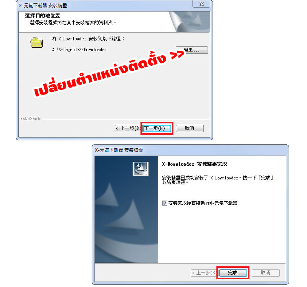 4. เราสามารถเปลี่ยนตำแหน่งติดตั้งโปรแกรม X-Downloader ได้ตัวเกง โดยกดปุ่มดังรูป หลังเลือกเสร็จกดปุ่ม "下一步" → "安裝" เพื่อไปขั้นตอนถัดไป