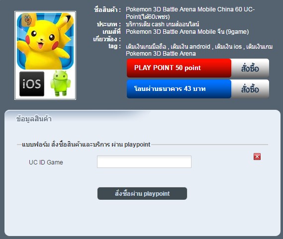 3. เลือกสินค้าและวิธีชำระเงิน (จะ SAO Mobile หรือ Pokemon 3D Battle Arena ก็ตรงนี้ได้แหละ) จากนั้นให้นำ UC id ที่เปิดดูจากด้านบนมากรอกที่ตรงนี้ได้เลย