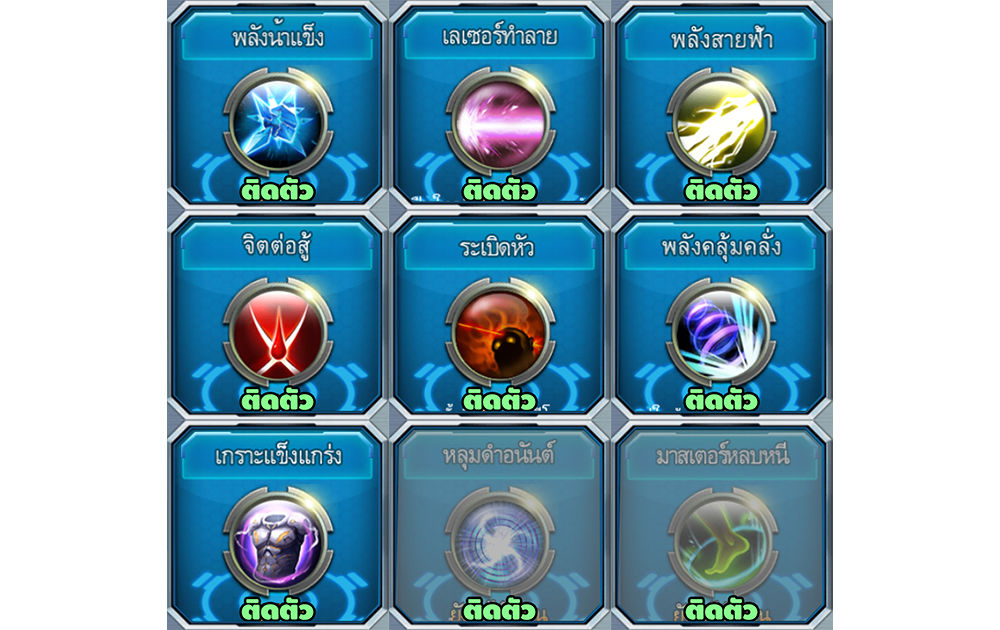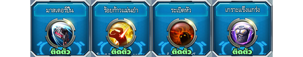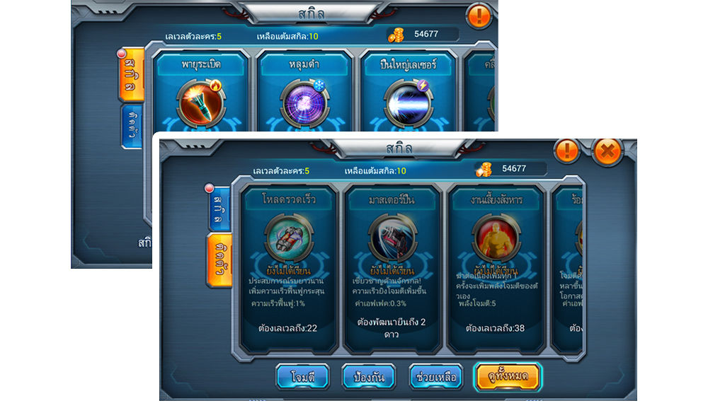 ในหน้าต่างสกิลติดตัวได้แบ่งสกิลออกเป็น 3สาย ได้แก่ "โจมตี", "ป้องกัน" และ "ช่วยเหลือ" ซึ่งถ้าหากเพื่อนๆ มองหาสกิลไหนไม่พบ แนะนำว่าให้กดปุ่มดูทั้งหมดที่มุมด้านล่าง