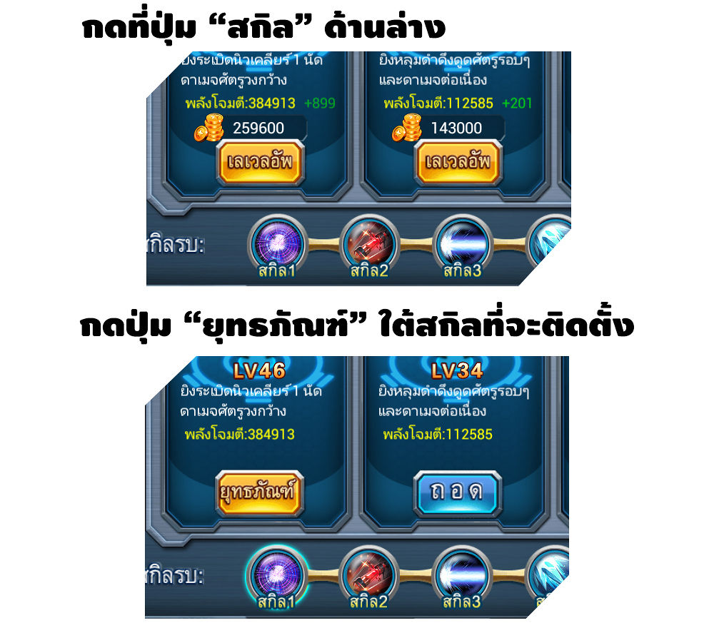 ในการติดตั้งสกิลนั้น ให้เรากดที่ปุ่ม "สกิลรบ" ด้านล่าง จากนั้นกดปุ่ม "ยุทธิภัณฑ์" ด้านล่างสกิลที่ต้องการใช้งาน เสร็จแล้วกดปุ่ม "บันทึก" ที่มุมขวาล่าง เป็นอันเสร็จสิ้นจ้าา