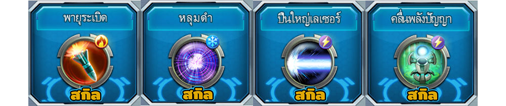 สกิลปืนใหญ่เลเซอร์ : เป็นสกิลที่ยิงเผาเกราะ สร้างความเสียหายได้เยอะมากๆ เพราะมีสกิลติดตัว ที่ช่วยเสริมความสามารถอยู่