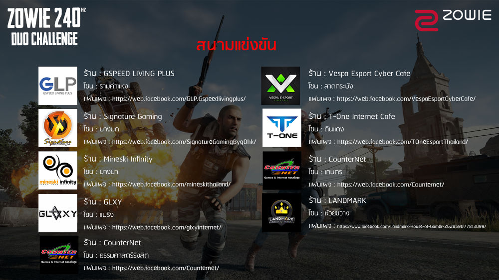 การแข่งขัน ZOWIE 240 Hz DUO CHALLENGE จะเป็นการแข่งขันในรูปแบบของ DUO โดยแต่ละทีมจะต้องสมัครการแข่งขันเป็นตัวแทนร้านอินเตอร์เน็ตคาเฟ่ชั้นนำในกรุงเทพฯ และปริมณฑลที่ร่วมโครงการ ประกอบไปด้วย
