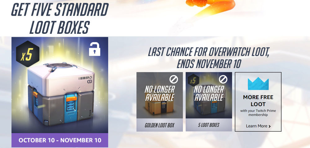 เกมเมอร์สายรับชม Stream เกม และ Streamer ทั้งหลาย ที่เป็นสมาชิกของ Twitch Prime ตอนนี้ได้แฮปปี้กันอีกรอบครับ เพราะของรางวัลแจกฟรีสำหรับสมาชิก Twitch Prime ประจำเดือนตุลาคมนี้ เพราะเป็นของรางวัลจากเกมยอดฮิตของผู้เล่นทั่วโลกนั่นคือ Overwatch นั่นเอง โดยของรางวัลที่ได้คือ Loot Box แบบธรรมดาถึง 5 กล่องด้วยกัน