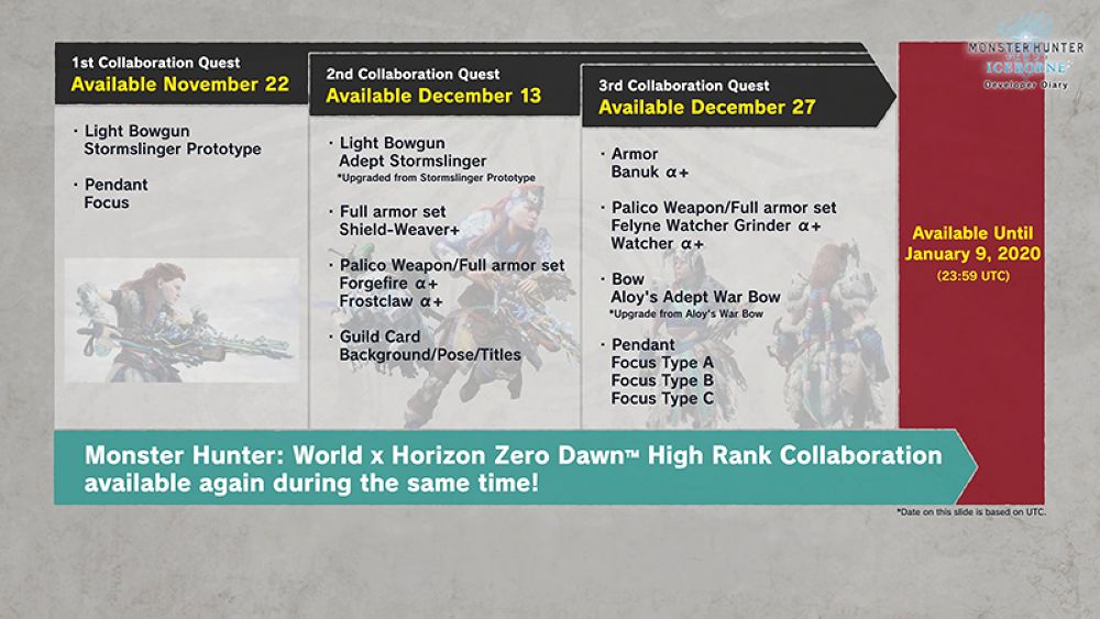 ถัดมาจะเป็นเรื่องของอีเว้นท์พิเศษ Monster Hunter: World X Horizon Zero Dawn High Rank Collaboration นั้นจะมีทั้งหมด 3 รอบด้วยกัน โดยรอบแรกกับเควสที่ให้ทำ Light Bowgun และ Pendant Focus เมื่อวันที่ 22 พฤศจิกายนที่ผ่านมาแล้ว ยังมีรอบที่ 2 ในวันที่ 13 ธันวาคมนี้ กับการทำเควสอีเว้นท์สำหรับอัพเกรด Light Bowgun อัพเกรด Full Armor set ชุดและอาวุธแมว Palico และ Guild Card พิเศษ และครั้งที่ 3 ในวันที่ 27 ธันวาคม ที่จะปล่อยเควสอีเว้นท์ให้ทำชุด Armor Banuk A+ ธนูอัพเกรดของ Aloy  และ Pendant Focus 3แบบ อีกด้วย ซึ่งเควสเหล่านี้ จะให้ทำจนถึงวันที่ 9 มกราคม 2020 ซึ่งเป็นวันเดียวกับที่ตัวเกมเวอร์ชั่น PC เปิดให้บริการนั่นเอง