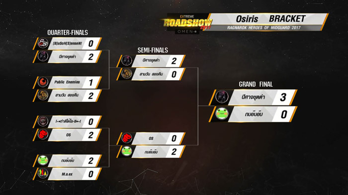 สรุปผลการแข่งขันสุดมันส์ Hero of Midgard : Group Osiris กรุงเทพฯและภาคกลาง หลังจากผ่านการแข่งขันอันเข้มข้นมาตลอดทั้งวัน เฟ้นหาทีมสุดแกร่งหนึ่งเดียวที่จะได้ครอบครองชัยชนะและก้าวเข้าไปรอในรอบ Final เป็นทีมแรก ซึ่งผลก็คือทีม "ปีศาจชุดดำ " นี่เองที่สามารถกวาดคะแนนแบบรวดเดียวและได้ฉายาแชมป์ Hero of Midgard ภาคกลางมาครอบครองอย่างง่ายดาย