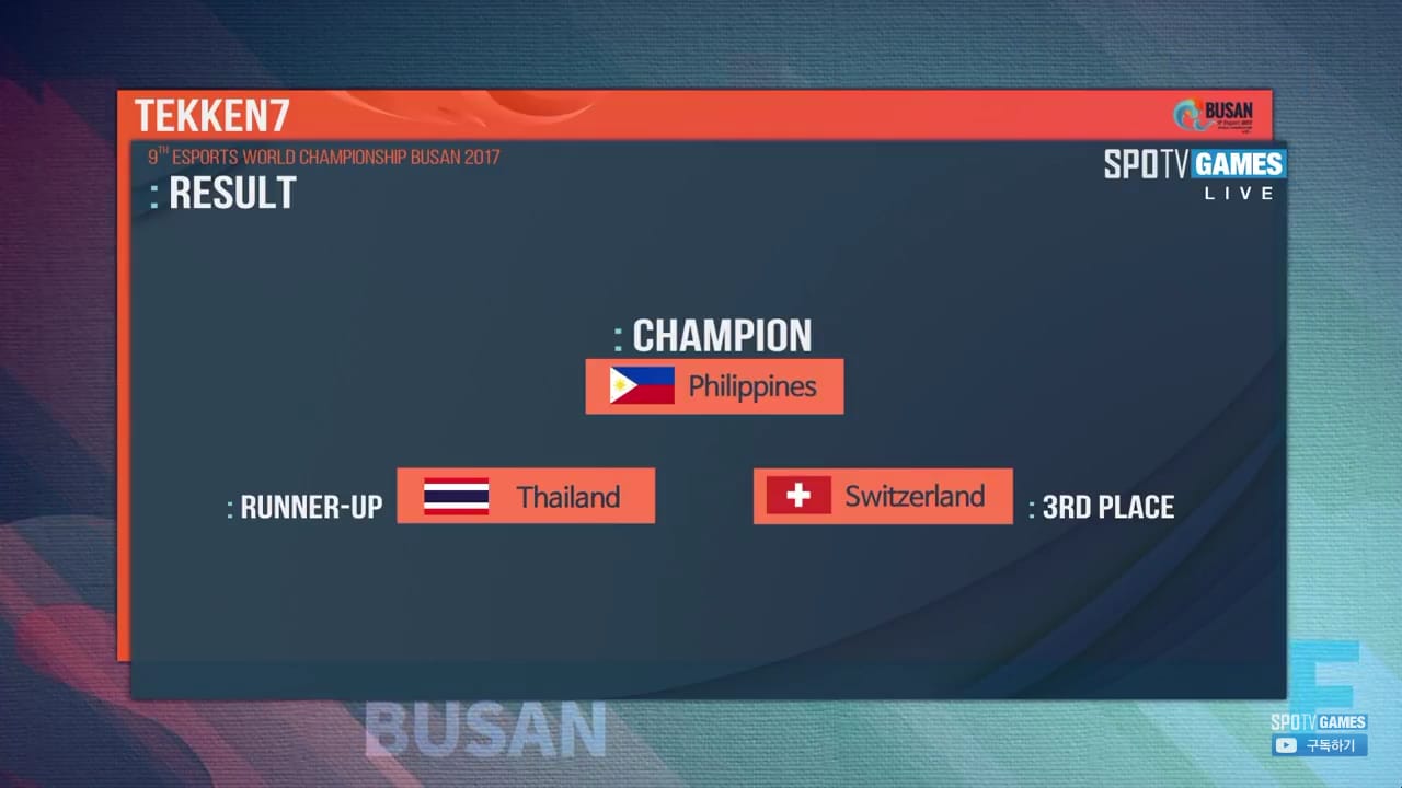 ในรอบแรก Book ตัวแทนจากประเทศไทยได้อยู่ในกลุ่ม B ซึ่งประกอบด้วยเกาหลีใต้, ฟิลิปปินส์, ออสเตรเลีย, ฟินแลนด์และสวีเดน ซึ่งถือว่าเป็นสายแข็งที่น่ากลัวสำหรับ Book เนื่องจากเกาหลีใต้และฟิลิปปินส์นั้นมีคะแนนอันดับ World Tour รายการใหญ่ของ Tekken 7 ในระดับที่ไล่เลี่ยกัน ซึ่งในรอบคัดเลือกนั้น Book ก็สามารถทำผลงานได้ดีนั่นคือ ชนะ 3 แพ้ 2 สามารถเข้ารอบ 16 คนสุดท้ายไปได้ รอบ 16 คนสุดท้าย ไทย เจอกับ อาเซอร์ไบจาน ซึ่งในนัดแรกนั้น Book สามารถเอาชนะได้ แต่ทว่าทางคณะกรรมการนั้นไม่นับผลการแข่งขันให้เนื่องจากในรอบนั้นไม่มีกรรมการนั่งดูการแข่งขันของทั้งคู่ จึงทำให้ต้องแข่งใหม่กันอีกรอบ ผลคือไทยสามารถเอาชนะ อาเซอร์ไบจานได้ด้วยผลคะแนน 3-0 ผ่านเข้าสู่รอบ 8 คนสุดท้าย ในรอบ 8 คนสุดท้ายไทยเจอกับอินเดีย โดย Book นั้นยังคงใช้ Jin ตัวละครคู่ใจของเขา ในสองรอบแรก อินเดียได้ใช้ Nina ในการต่อสู้ ทำให้ Book สามารถเก็บสองแต้มแรกไปได้ ในรอบที่สาม อินเดียเปลี่ยนตัวมาใช้ Jack-7 ซึ่งก็สามารถตีไข่แตกทำแต้มให้อินเดียได้ แต่ท้ายที่สุด Book ก็เอาชนะไปได้ 4-1 ทำให้ไทยได้ผ่านเข้ารอบ 4 คนสุดท้ายเจอกับสวิซเซอร์แลนด์ครับเข้าสู่รอบ 4 คนสุดท้าย ไทยเจอกับสวิซเซอร์แลนด์ โดยสองรอบแรก Book สามารถเก็บแต้มนำได้ก่อน และต่อมา ฝ่ายสวิซเซอร์แลนด์ใช้ Eliza ตีตื้นตามมาได้ และผลัดกันได้แต้มคนละแต้ม และในรอบสุดท้าย Book ตัวแทนประเทศไทยสามารถเอาชนะสวิซเซอร์แลนด์ไป 5-4 ได้เข้ารอบชิงพบกับฟิลิปปินส์รอบสุดท้ายระหว่างไทยและฟิลิปปินส์ Book ได้ใช้ Jin พบกับ Shaheen ของทางฝั่งฟิลิปปินส์ ในสองรอบแรกทำให้ทั้งคู่ได้แต้มเท่ากัน 1-1 พอมาถึงในรอบที่สาม ฟิลิิปปินส์เปลี่ยนตัวละครเป็น Kasumi เจ้า Book สามารถทำแต้มนำได้ 2-1 หลังจากนั้น ฟิลิปปินส์ เอาคืนตามมาได้เป็น 2-2 และบุกหนักจนเป็น 4-2 และในรอบที่เจ็ด Book มีโอกาสที่จะทำคะแนนคืนตามมาเป็น 3-4 จนท้ายที่สุด ฟิลิปปินส์ก็ใช้เทคนิคบุกเข้า Wall จนทำให้ฟิลิปปินส์ชนะในคะแนน 5-3 ทำให้ได้แชมป์ในรายการนี้ไป ส่วน Book ตัวแทนจากประเทศไทยได้อันดับที่สองในงาน 9th Esport 2017 World Championship ประเภทเกม Tekken 7 ครับ