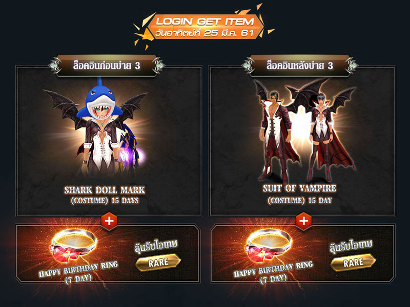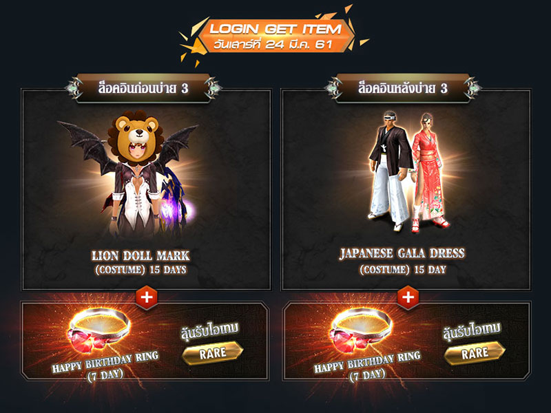 **สุ่มได้รับไอเทม 1 ชิ้นอย่างใดอย่างหนึ่ง / รอบการล็อคอินเท่านั้น สงวนสิทธิ์ 1 ไอดีรับไอเทมได้ 1 ครั้ง / รอบเท่านั้น (1 วันรับได้สูงสุด 2 รอบ) ไอเทมจะได้รับภายใน 7 วันทำการ