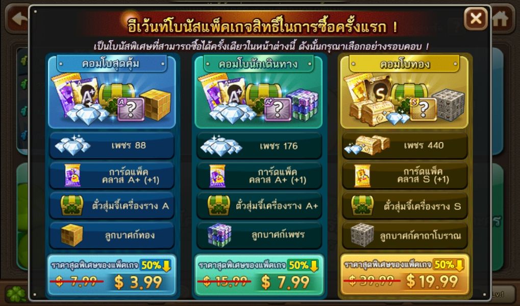 1.คอมโบสุดคุ้ม ในราคา 3.99 ดอล ลดจาก 7.99ดอล แพ๊กนี้จะได้รับ เพรช 88 เม็ด การ์ดแพ๊คคลาส A+ ตั๋วสุ่มจี้เครื่องราง A ลูกบาศก์ทอง