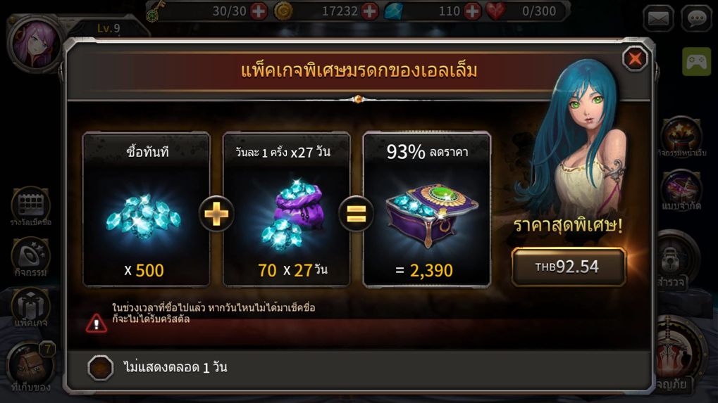 โปรโมชั่นนี้จะราคาอยู่ที่ 95.54 บาทเท่านั้นครับโดยเมื่อซื้อครั้งแรกแล้วจะต้องมาล๊อกอินเพื่อรับเพรชโบนัสอีก 27วันถึงจะได้ได้เพรชครบตามยอดตามนี้เลย