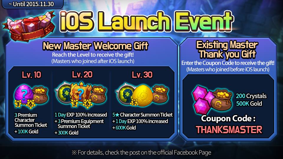 โดยกิจกรรมเก็บเลเวลนี้ สิ้นสุดในวันที่ 30.11.2015 สุดท้ายนี้ถ้าใครได้เข้าร่วมก่อนที่ iOS จะเปิดตัวก็สามารถนำ Coupon Code “THANKSMASTER” ไปกรอกเพื่อรับ