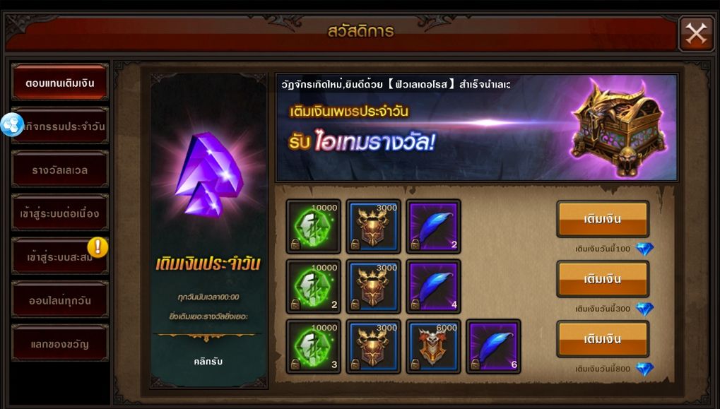 2.เติมเพรชตั้งแต่ 300 เม็ดขึ้นไปจะได้รับ 10000 Magic cystal 2 อัน ตราความสำเร็จ 1 อัน ขนนก 4 อัน