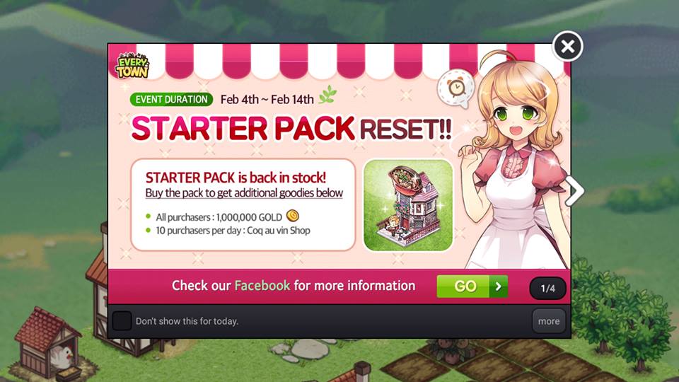 โปรโมชั่นที่สามจากเกมทำฟาร์ม Every town มาพร้อมกับแพ๊กเกจ มือใหม่ที่กลับมาอีกครั้งพร้อมกับความคุ้มสุดๆ ส่วนจะได้อะไรบ้างในโปรโมชั่นนี้นั้นไปดูกันเลย!!ถ้าซื้อ Starter pack ตอนนี้จะได้ของเสริมดังนี้1. สำหรับทุกคนที่ซื้อจะได้รับ Gold 1,000,0002. ทุกๆ 10 คนที่ซื้อแพ๊คในวันนั้น : จะได้รับ ร้าน Coq au vin Shopโปรโมชั่นที่สี่จากเกม Soul Seeker ของสัปดาห์ที่ผ่านมานี้ โปรโมชั่นของ Soul Seeker ในรอบนี้จะมีโปรโมชั่นสุดคุ้มอะไรบ้างไปส่องกันเลย