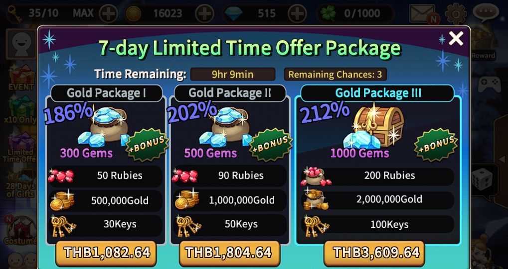 แพ๊คเกจ 3 ชุดใหญ่ มีดังนี้1.Gold package I ราคา1,082.64 บาท2.Gold Package II ราคา 1,804.64 บาท3.Gold Package III ราคา 3,609.64 บาทโปรโมชั่นสุดท้ายจากเกม Rise of the Dragon ในสัปดาห์ที่ผ่านมาก็มีโปรโมชั่นเติมเพรชหลายๆรูป แบบมาแนะนำ ทุกท่านกัน ส่วนจะมีอะไรบ้างในวันนี้ไปดูกันเลย