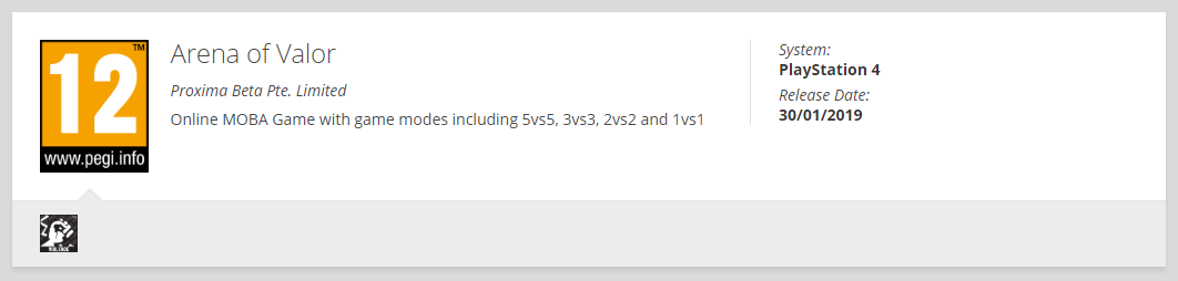 Pan European Game Information (PEGI) ได้จัดอันดับเรทของเกม Arena of Valor ไว้พร้อมกำกับ System ว่าเป็น Playstation 4 ซึ่งงานนี้ก็ต้องรอดูกันไปว่าจะเป็นเรื่องจริงหรือไม่ สำหรับ RoV ก็คงไม่ต้องพูดถึงให้มากความ เป็นเกมแนว MOBA 5v5 ที่ผู้เล่นจะต้องหยิบฮีโร่มาทีมละ 5 ตัวจากนั้นก็ต่อสู้ตีป้อมกันไปจนถึงป้อมในสุดเพื่อเอาชนะกัน พอไปเล่นบน PS4 แล้วก็นึกภาพการควบคุมไม่ออกเหมือนกันนะเนี่ย