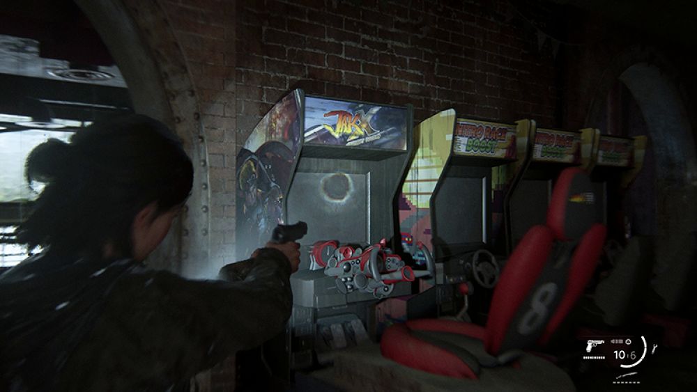 นอกจากเครื่องเกมของฝั่ง PlayStation แล้ว ยังมีตู้เกมๆ หนึ่งที่ปรากฏอยู่ใน The Last of Us: Part II อีกด้วย โดยในฉากที่ Ellie มายังร้านเกมจะพบเห็นว่ามีตู้เกมอาเขตมากมายเต็มไปหมด และหนึ่งในนั้นมีตู้เกมแข่งรถชื่อว่า Jax X: Combat Racing ผลงานเกมแข่งรถจากซีรี่ส์ Jax and Daxter ที่พัฒนาโดย Naughty Dog นั่นเอง