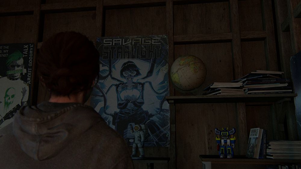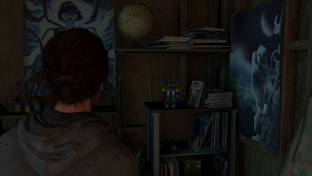 กลับมาที่ฉากห้องสมุดในฉากลาดตระเวนของ Ellie และ Dina ช่วงต้นเกม หากเดินสำรวจที่โซนของเด็กจะสังเกตเห็นตุ๊กตายีราฟ ทางด้านขวามือ ซึ่งนั่นคือการสื่อว่า Ellie และ Joel เคยมีความทรงจำร่วมกันกับเจ้ายีราฟ ในช่วงท้ายเกมของ The Last of Us ภาคแรกนั่นเอง