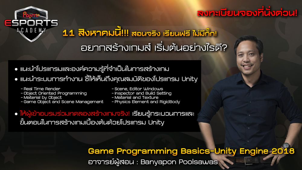ชวนคุณมาเรียนรู้การใช้งานโปรแกรมและเครื่องมือ การเขียนชุดคำสั่ง ระบบควบคุม และการเตรียมโปรเจ็คการสร้างเกม แม้ไม่มีความรู้มาก่อนก็เรียนได้ มือใหม่อยากหัดสร้างเกมเอง ต้องโดน งานนี้อาจารย์ตัวจริงมาเอง สอนฟรี ไม่มีกั๊ก "อยากสร้างเกมส์ เริ่มต้นอย่างไรดี?" ที่นี่เรามีคำตอบ เสาร์ที่ 11 สิงหาคมนี้