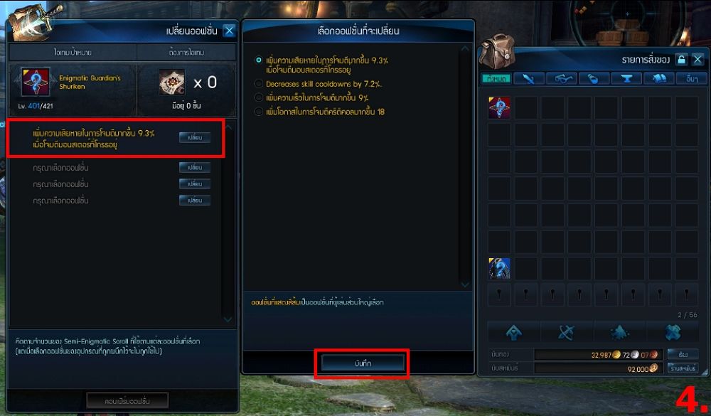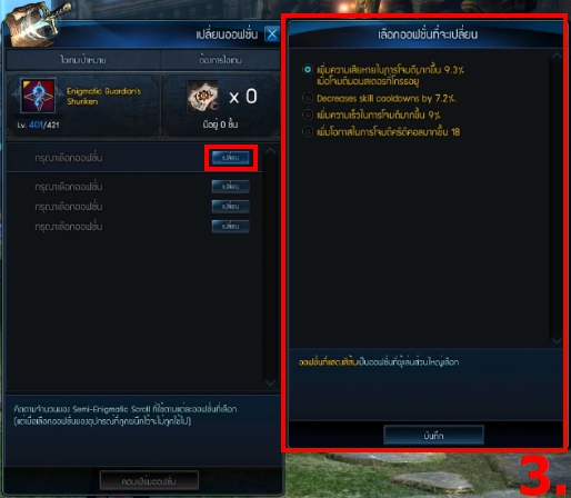 เมื่อผู้เล่นต้องการเลือกออฟชั่นให้ของสวมใส่ ให้กดปุ่ม “เปลี่ยน” จากนั้นจะมีหน้าต่าง “เลือกออฟชั่นที่จะเปลี่ยน” ขึ้นมาให้เลือกความสามารถต่างๆ ของออฟชั่น (รูปที่ 3)
