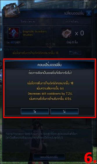 เมื่อกดคอนเฟิร์ม แล้วจะมีหน้าต่างขึ้นมายืนยันการเลือกออฟชั่นอีกครั้ง เพื่อเช็คความถูกต้อง ถ้าผู้เล่นเลือกออฟชั่นถูกต้องทั้งหมดก็ให้กดปุ่ม “ใช่” เพื่อยืนยันเลือกออฟชั่นตามที่เลือก แต่ถ้าเลือกผิดหรือยังไม่ถูกใจก็ให้กด “ไม่” เพื่อกลับไปเลือกออฟชั่นใหม่ก่อนหน้านี้ได้ (รูปที่ 6)