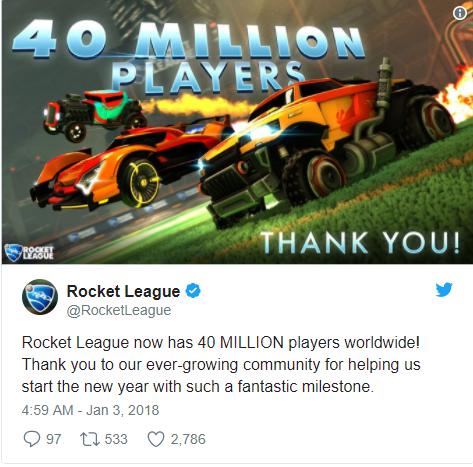 ตัวเกมมียอดผู้เล่นแล้วกว่า 40 ล้านคน!Psyonix ทีมผู้สร้างและจัดจำหน่ายเกม Rocket League ออกมาเปิดเผยว่าในช่วงปลายปีที่ผ่านมาตัวเกมมียอดผู้เล่นทั่วโลกเกิน 40 ล้านคนไปเป็นที่เรียบร้อยแล้วพร้อมทั้งทวีตภาพขอบคุณแฟนๆทางทวีตเตอร์ โดยยังได้กล่าวกับแฟนๆว่า ขอขอบคุณแฟนๆและผู้เล่นรวมไปถึงกลุ่ม Community ทุกคน ที่ช่วยให้พวกเราก้าวเข้าสู่ปีใหม่ด้วยความอัศจรรย์ใจนี่