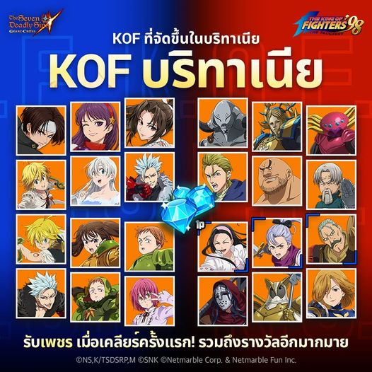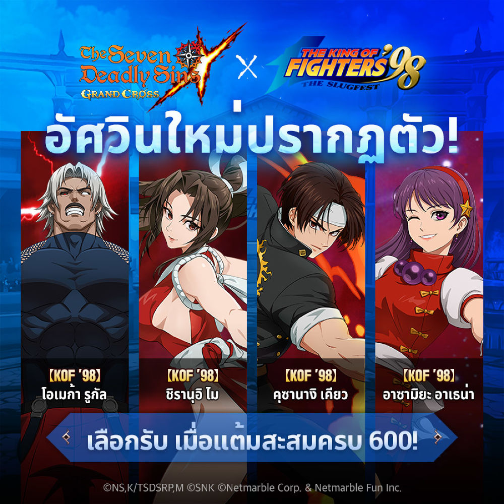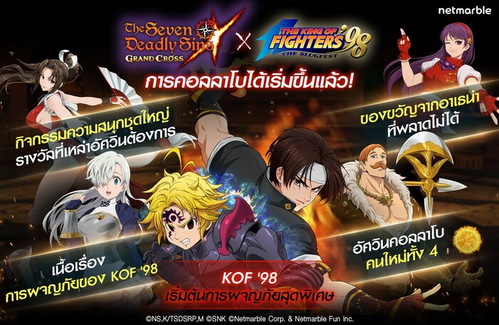 เรียกว่าเป็นการจับคู่คอลลาโบที่แปลกและพิเศษจริงๆ เมื่อเกมจากการ์ตูนสุดมันส์อย่าง The Seven Deadly Sins: Grand Cross จับมือกับเกมไฟต์ติ้งระดับตำนานอย่าง The King of Fighters' 98 ซึ่งการคอลลาโบครั้งนี้ได้สร้างความพิเศษด้วยการเพิ่มคาแรกเตอร์ใหม่ที่มาจากซีรี่ส์ราชันย์นักสู้ พร้อมกิจกรรมสุดพิเศษเพื่อเป็นการฉลองคอลลาโบในครั้งนี้