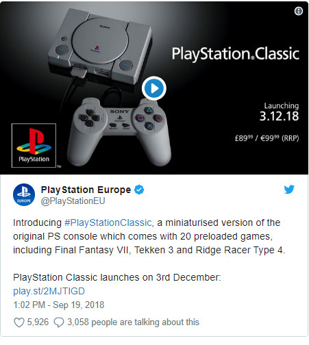 Playstation Classic หรือเครื่องเล่นเกมที่จำลองรูปร่างหน้าตาคล้ายกับเครื่อง Playstation 1 และบรรจุเกมบนแพลตฟอร์มนั้นมาให้เล่นกันอย่างจุใจถึง 20 เกม ซึ่งตอนนี้เปิดเผยออกมาเพียงส่วนหนึ่งเท่านั้น แต่หนึ่งในนั้นมีเกมชื่อดังในตำนานอย่าง Final Fantasy VII ด้วย ตอนแรกก็ดูเหมือนกระแสจะดีครับ