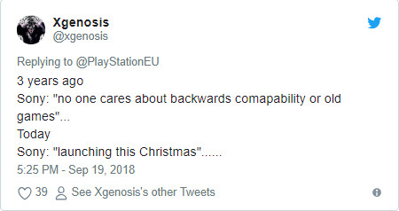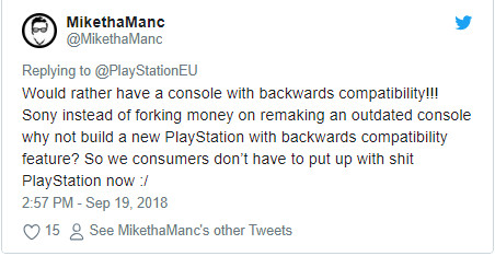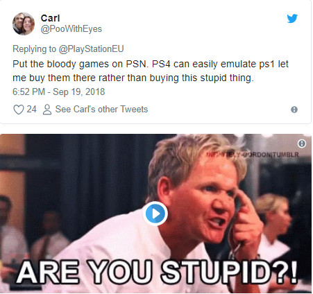 แต่พอหลายคนทราบเรื่องราคากันก็มีจำนวนไม่น้อยเลยทีเดียวที่ไม่แฮปปี้กับราคานี้กันสักเท่าไรนักตามภาพด้านบนคือการประกาศเปิดตัว Playstation Classic อย่างเป็นทางการและก็มีทวีตอย่างดุเดือดตามมาดังนี้Carl ผู้ใช้ทวิตเตอร์ท่านหนึ่งแสดงความเห็นว่า เิาไอ้เกมพวกนี้ไปใส่ไว้ในระบบ PSN และเล่นบน PS4 มันยังจะง่ายกว่าเสียเงินซื้อไอ้เครื่องจำลอง PS1 โง่ๆเครื่องนี้MikethaManc อีกหนึ่งผู้ใช้งานก็ทวิตว่า แทนที่จะทำแบบนี้ก็แล้วทำไมไม่สร้าง Playstation รุ่นใหม่ให้มันทำงานร่วมกันกับเกมเก่าๆได้ล่ะ ผู้บริโภคจะได้ไม่ต้องเสียเงินซื้อไอ้เครื่องนี้เพิ่มถ้าอยากจะเล่นมันXgenosis ก็ออกมาเหน็บเบาๆแต่เจ็บว่า 3 ปีที่แล้ว โซนี่บอกไม่มีใครสนใจเไอ้เกมเก่าๆอะไรแบบนี้หรอก แต่พอมาวันนี้ โซนี่บอกว่า เปิดตัวคริสต์มาสต์นี้นะจ๊ะและก็นั่นแหละครับ เกมเมอร์อีกหลายคนได้เกิดอาการงุนงงปนข้องใจ ว่าถ้าจะทำแบบนี้จริงๆทำไมไม่ยอมเอาตัวเกมมาขายบน PSN ให้เล่นกันบน PS4 มันซะเลย (เพราะมันมีเกมที่ทำได้ และขายอยู่ตอนนี้) แต่กลับกลายเป็นเอาเครื่องจำลองมาขายแทน แต่ก็ไม่ใช่ทุกคนจะรังเกียจมันไปซะหมด เพราะมีผู้เล่นจำนวนมากที่หวนระลึกถึงวันเก่าๆ และยินดีที่จะยอมจ่ายเงินจำนวน 99.99$ เพื่อซื้อเจ้าเครื่องนี้ด้วยครับ แล้วเพื่อนๆล่ะครับ คิดเห็นยังไงกับเจ้าเครื่องนี้กัน ?